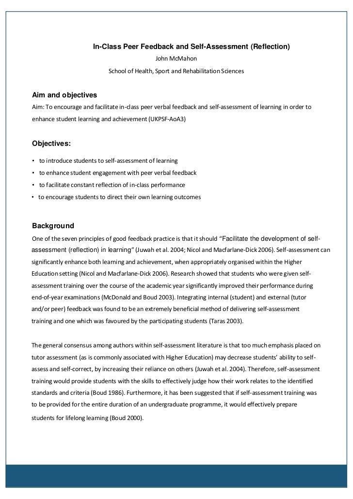 Essay "Self reflection essay" - grade HD - MGF 1100 ... from d20ohkaloyme4g.cloudfront.net Assignment self reflection paper example. Check spelling or type a new query. Maybe you would like to learn more about one of these? We did not find results for: